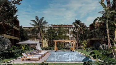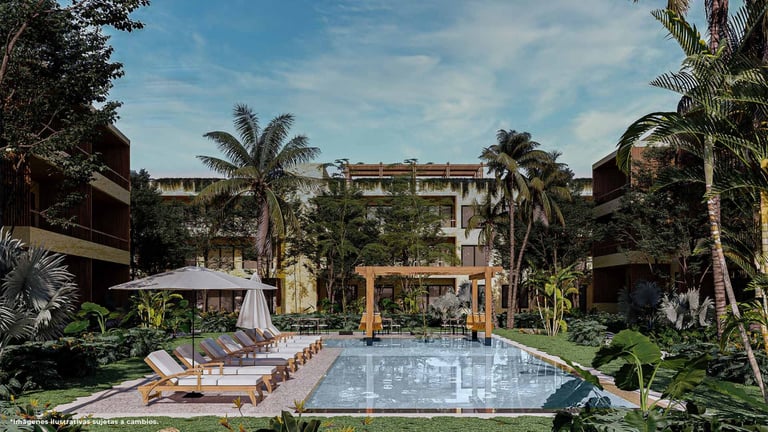Casa Club & Alberca: Espacios diseñados para el descanso, con alberca semi-olímpica ideal para nadar y relajarse bajo el sol de Nayarit.