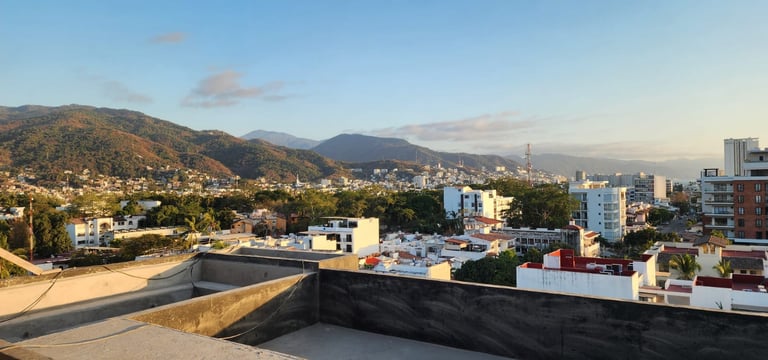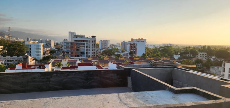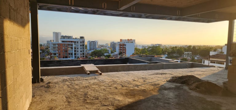 Así se vive la experiencia desde la cima de Terra 242. Con la obra en etapa final, ya puedes apreciar las impresionantes vistas panorámicas hacia la ciudad y las montañas que disfrutarás desde nuestro Rooftop. Un espacio exclusivo diseñado para relajarte en la alberca infinity mientras contemplas los mejores atardeceres de Puerto Vallarta. ¡El lugar ideal para tus reuniones y momentos de descanso ya es una realidad!