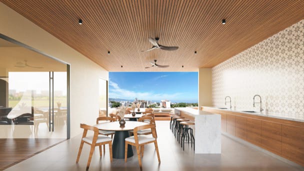 Detalles Premium: Pisos de gran formato y acabados modernos en cocinas y baños, pensados para un estilo de vida sofisticado en el trópico